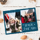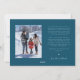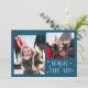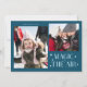 Minimal and modern holiday photo template card featuring 2 photos on the front with a typography text that says "magic in the air" with stars. You can also add another picture and message on the back. The background is teal.