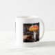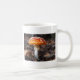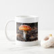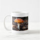 Classic Amanita Muscaria mushroom in the forest with leaves.
