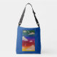 Crossbody bag with image of a rainbow coloured sky with clouds and stars. Original artwork is acrylics on canvas board.