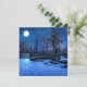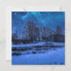 Snowy park with beautiful bridge over small pond, street light and covered in snow trees in winter in night. Beautiful winter night