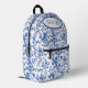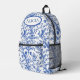 Fanciful birds fly among flowering branches in a blue flowering toile de jouy desgin on this beautiful backpack.