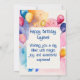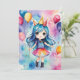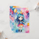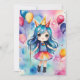 A vibrant digital illustration featuring a cheerful girl with long, flowing teal-blue hair, big expressive eyes, and a galaxy-inspired outfit. She wears a party crown with golden accents and holds a balloon in one hand as she smiles brightly. Her ombré dress blends shades of sunset pink, orange, and deep purple, and she's paired it with black high-top sneakers and a small orange bow tie. The background is a festive watercolor swirl of balloons, stars, and dreamy pastel hues, creating a magical celebration scene full of energy and fun.