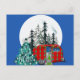 Whimsical watercolor illustration features a magical Christmas scene complete with trees, full moon, snow, retro style camping RV and tiny green clothed tomte style gnome on the step of the camp trailer.