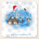 A Christmas night scenery in blue magic with a Merry Christmas calligraphy script, a Christmas hat, candy and winter cherries.