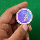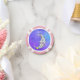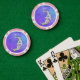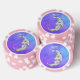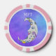 These poker chips have a magical white crescent moon with a face having blue eyes and decoration with various abstract shapes of circles, scroll, and triangles in blue, yellow, and purple on a purple sky background. Customise your initials or text with the templates.