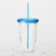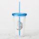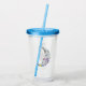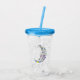 This acrylic drink tumbler with straw and lid has a magical white crescent moon with a face and pink lips with colourful abstract markings in various shapes in blue, yellow, and purple.