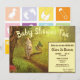 This invitation for a baby shower and/or tea features a magical fantasy forest bright with sunlight. A baby is riding a white dog while a cat with stacked luggage on its back follows. The details of your event are in a boxed area at the bottom right. Deep brown text is clean against a pale yellow background. Each line of text is easily changeable for the specifics of your party.