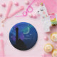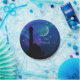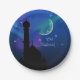 Eid Greeting illustration with a magical evening sky scene: silhouette of a mosque on a blue night sky with shiny stars and moon.