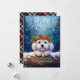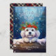 This adorable holiday greeting card features a cute Bichon Frise illustration wearing a festive crown wreath of holly, pine, and berries, with snowflakes gently falling against a Blue Sky background. The little Bichon Frise Dog is peeking over the snow-capped log to say hello! The playful text "Jolly Holiday Wishes" adds a warm seasonal greeting, and can be customised as you like. The reverse side is decorated with a classic plaid check, adding a traditional touch to the overall design. This cute, playful card is perfect for sending holiday cheer to family and friends, and the customisable name and date make it a personalised keepsake.