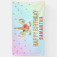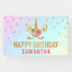 Amaze your guests with this cute unicorn theme birthday party banner featuring a beautiful faux gold glitter unicorn face and pretty flowers with faux gold glitter typography on a pastel rainbow gradient background.