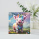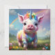 In the heart of a vibrant meadow with wildflowers, a colorful baby pig unicorn frolics joyfully under the arch of a radiant rainbow stretching across the sky. The piglet's soft, chubby body is adorned in pastel pinks and purples, with shimmering patches of gold and blue that catch the sunlight. Atop its tiny head is a spiraled horn, delicate and glowing with an blue iridescent light, as if it holds the very essence of magic.