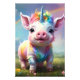In the heart of a vibrant meadow with wildflowers, a colourful baby pig unicorn frolics joyfully under the arch of a radiant rainbow stretching across the sky. The piglet's soft, chubby body is adorned in pastel pinks and purples, with shimmering patches of gold and blue that catch the sunlight. Atop its tiny head is a spiralled horn, delicate and glowing with an blue iridescent light, as if it holds the very essence of magic.