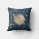 This magical throw pillow features imaginary planets, moon and stars in navy and gold colorway.