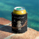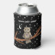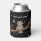 This can or bottle cooler has a magical brown owl with golden eyes sitting on a tree branch wearing a purple crystal necklace under the moon and stars in a black night sky. Customise your text on the front and back with the template.