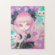 Cute kawaii girl with flowing pink ponytails tied with black bows, in a black dress, with two adorable aqua blue owls, magical stars, and pastel Autumn leaves.