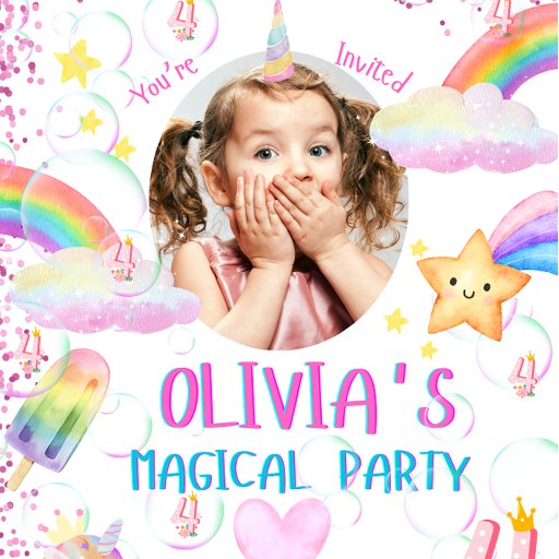 Bring the magic of rainbows and unicorns to life with our Magical Party Birthday Accents! PingKarma Custom Personalised Photo Party Table Confetti fantastically complements the entire Magical Party Collection. These adorable confetti circles are designed to perfectly coordinate with the magical, unicorn, rainbow theme of this sparkling collection. Featuring the bubbles, the unicorn, the headpiece, the star, and the birthday girl this cute confetti is a tiny detail that makes a big impact, The one of a kind confetti with the personalised invites and the matching party hats and banners all beautifully comes together to create an enchantingly magical party playland no one will ever forget. This confetti feature an adorable photo of the birthday child to the amazement of her guests as it sprinkles and sparkles across all the magical party tables. Add a touch of enchantment to your celebration with our Magical Party Table Confetti! This personalised photo confetti is part of PingKarma's Magical Party Collection, designed to bring rainbows, unicorns, and sparkling joy to your special day. Featuring all the whimsical elements like glittery stars and pastel rainbows, this confetti beautifully complement the entire collection. Perfect for creating a magical, one-of-a-kind party experience that everyone will remember!