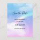 Save the date postcard with a soft and lovely background image. Pastel blues and pinks clouds and a magical rainbow.