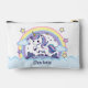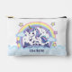 Adorable accessory bag ideal for a pencil case featuring a cute cartoon drawn unicorn. She has a colourful mane and tail in pastel blues, pinks and purples, a yellow horn on the crown of her head, a white body and purple hooves. She is standing on purple grass with purple bushes in the background and surrounded by colourful stars, a beautiful rainbow and fluffy clouds. Below the illustration is a template to add your name or other text to personalise.