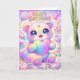 Send a world of wonder with this enchanting children's birthday card featuring an adorable rainbow puppy. This fluffy golden pup wears a shimmering moon and star crown while holding a magical swirl lollipop. Surrounded by a dreamscape of pastel clouds, floating hearts, and vibrant rainbows, this celestial scene is filled with starlight and joy. This vertical design is the perfect way to share magical birthday wishes with any child who loves puppies and fairytale adventures.