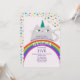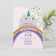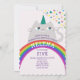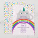 Cute, girly, magical, rainbow birthday invitation for kids, with colourful stars and kawaii cat unicorn.