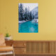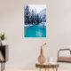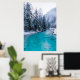 Landscape photograph of a blue magical river in a snowy covered winter forest.