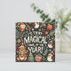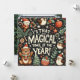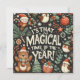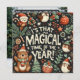 An adorable Christmas-themed design featuring cute woodland animals—cute bears and festive birds—dressed in cosy winter scarves and surrounded by holiday presents. The soft colour palette of red, white, and grey, paired with decorated Christmas trees, stars, and delicate floral elements, brings a Scandinavian-inspired charm. The "It's that Magical time of the year" message completes this heartwarming, whimsical holiday scene, perfect for cards and seasonal decor.