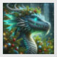A magical Christmas dragon with blue and turquoise scales and glowing turquoise eyes wearing a festive crown of fir boughs, pinecones and berries and surrounded by fir trees, Christmas ornaments, berries and tiny golden glowing lights.