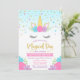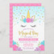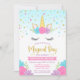Whimsical unicorn birthday party invitations for a little girl. This fun design features a cute unicorn face illustration, stars and flowers. Trendy pink, purple, teal and a touch of faux gold glitter.