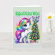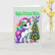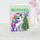 A cute unicorn with mane and tail in rich rainbow colors is just putting the last of the decorations on the christmas tree, his friend the christmas wish fairy sits on top of the tree. With the text .. Magical christmas wishes .. in the background, a fun fantasy card