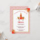 This front of this beautiful, girly invitation features the text, "A magical day is on the way" in red in popular script typography, along with trendy unicorn ears and eyes with a red, orange and brown horn and a crown of hand painted fall-coloured watercolor flowers. The customisable birthday girl's name appears in red, followed by her age and all the party details, which you can also personalise with this template. The front of the card is bordered by a gold edge and a pattern of stars on a pink background, along with on bouquets of fall-coloured flowers, autumn leaves and stars on the corners. The back features a matching pattern of stars on a pink or rose gold background. This invitation is perfect for fall or Thanksgiving birthdays.