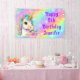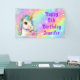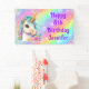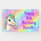 This fun Happy Birthday banner features a magical Unicorn with an aqua mane and golden horn against a rainbow background. Designed in purples, lavenders, and pinks with glittery sparkles and personalised with your name. Perfect for that magical unicorn party!