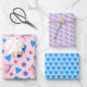 Wrapping paper sheets feature an original marker illustration of hearts and unicorns in blue, pink and purple.