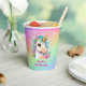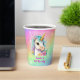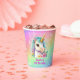 A magical Unicorn paper cup featuring a beautiful unicorn against a rainbow background with glittery sparkles. Designed in purples, lavenders and pinks and personalised with your information. Matching party supplies available.