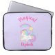 A personalized laptop sleeve with an adorable white unicorn with pastel green, purple, yellow and pink curly mane and tail. This magical creature is laying down sleeping peacefully with a rainbow colored shooting star flying over her head. Text says "Magical" in a pink trendy font. Pastel purple and white polka dot background.