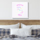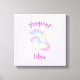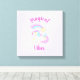 A canvas print with the words: Magical Vibes, written in a cute trendy pink font. Designed with a sleeping unicorn with pastel coloured curly mane and tail. A rainbow trails behind a shooting star flying abover. Adorable and cute. Pastel purple background.