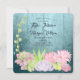 Pink, lavender, and pale green watercolor succulents on a with a rustic teal background and fairy lights for a magical desert day or night wedding.