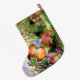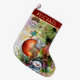 Hang this magical, large (12" x 20") double-sided stocking by the chimney with care! This unique, artistic design features a different whimsical scene on each side. On one side, a friendly snowman, a tiny mouse, a cute eagle hanging upside down, and a bird perch on a shiny ornament, with a personalised name banner for a custom touch. The reverse side reveals a sweet, sleepy reindeer ornament, adding to the festive charm. This stocking is the perfect way to add a touch of artistic wonder to your holiday decor.