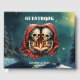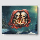 Magical winter moments, two skeletons reading by candlelight on a winter night. Two skeletons cuddle lovingly under a red blanket while reading a book together. A small candle provides warm, diffused light, making the scene cosy and slightly mysterious. In the background, stars and snowflakes shine in the dark sky, while snow lies on the floor and ceiling. The winter landscape with pine trees creates a tranquil, enchanting atmosphere full of warmth and magic.