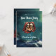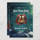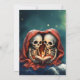 Magical winter moments, two skeletons reading by candlelight on a winter night. Two skeletons cuddle lovingly under a red blanket while reading a book together. A small candle provides warm, diffused light, making the scene cosy and slightly mysterious. In the background, stars and snowflakes shine in the dark sky, while snow lies on the floor and ceiling. The winter landscape with pine trees creates a tranquil, enchanting atmosphere full of warmth and magic.