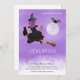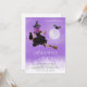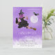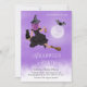 Spellbinding Witch-Themed Halloween Party Invitation! This captivating design showcases a magical full moon night scene, where young witch and her black cat soar across a purple night sky on their broomstick. Ideal for young witches and wizards, this invitation promises a night filled with enchanting adventures and spooky fun. Let the magic of Halloween begin!