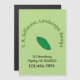 Green leaf with business info. Replace green graphic leaf with your business logo. Above leaf is line of curved text in green. Beneath is place to personalise with address and phone number in black. Pale green background may also be customised.