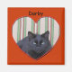 Black cat against tan, red and green striped background (replace with your image). Frame is a heart shaped wire cut into a red foreground. Personalise with name at top.