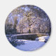 Round magnet featuring winter scene of river, bridge and snow-covered trees