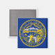 Crafted with attention to detail, this magnet proudly displays the flag of Nebraska, featuring a blue field with the state seal in gold and silver. The seal depicts a blacksmith hammering on an anvil, with a steamboat sailing on a river in the background, representing Nebraska's historical and economic significance.