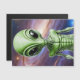 Magnetic postcard featuring a close-up of an alien with a background showing galaxies