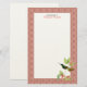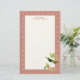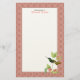 Personalised stationery with a vintage illustration of the Magnificent Hummingbird - a green and gold hummingbird perched on the branch of a tropical plant with pink flowers, with a vibrant coral pink damask pattern border. Matching postage stamps, return address labels and round envelope seal stickers available.