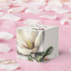 Wedding favour boxes with southern magnolia flowers and "thank you" message for guests. Fold up these little boxes (they are 2 inches cubed) and use at showers and / or the reception to say "thank you for being here". Fill with little treats. Box colour is light pink-beige with wrap around magnolia flowers design. A little flower bud is on the top beneath the wording.