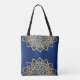 Elegant Navy Blue Tote Bag with an intricate faux gold Mandala flower design representing the blossoming of Purity within our Soul. Blue represents both the Sky and the Sea and is associated with open spaces, as well as loyalty, wisdom, and confidence. Perfect for a beautiful Summer happy ceremony. You can change the text from the Personalise Menu for Bridesmaid, Bride, Mother of the Bride, and Welcome. Original Design by SunFreeStar.