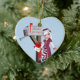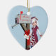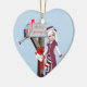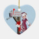 A cute "Holiday Greetings" Mail Carrier Elf double sided ceramic holiday ornament. This fun holiday ornament features a cute elf girl with a letter in her hand, standing next to a mailbox with presents at her feet! The mailbox has a red gift inside with a golden bow, and a bright red bow on it too. All are in front of a cheery blue wintery snow falling background. The mailbox also reads "Holiday Greetings" Digital art by XG Designs NYC. A great gift for friends, family or a special mail carrier, mailman, or mail woman! For more occupational, mail carrier holiday cards and gifts please visit our shop!