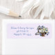 Mailbox art skinny address label with three lines of printed black text. An open mailbox with letters inside and a creeping vine with blue flowers is the artwork hand-drawn in pen and pencil.